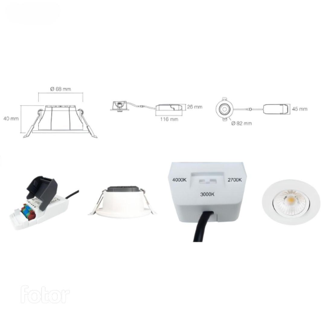 Diamètre encastrement : 68mm / diamètre collerette : 82mm / profondeur min. : 45mm